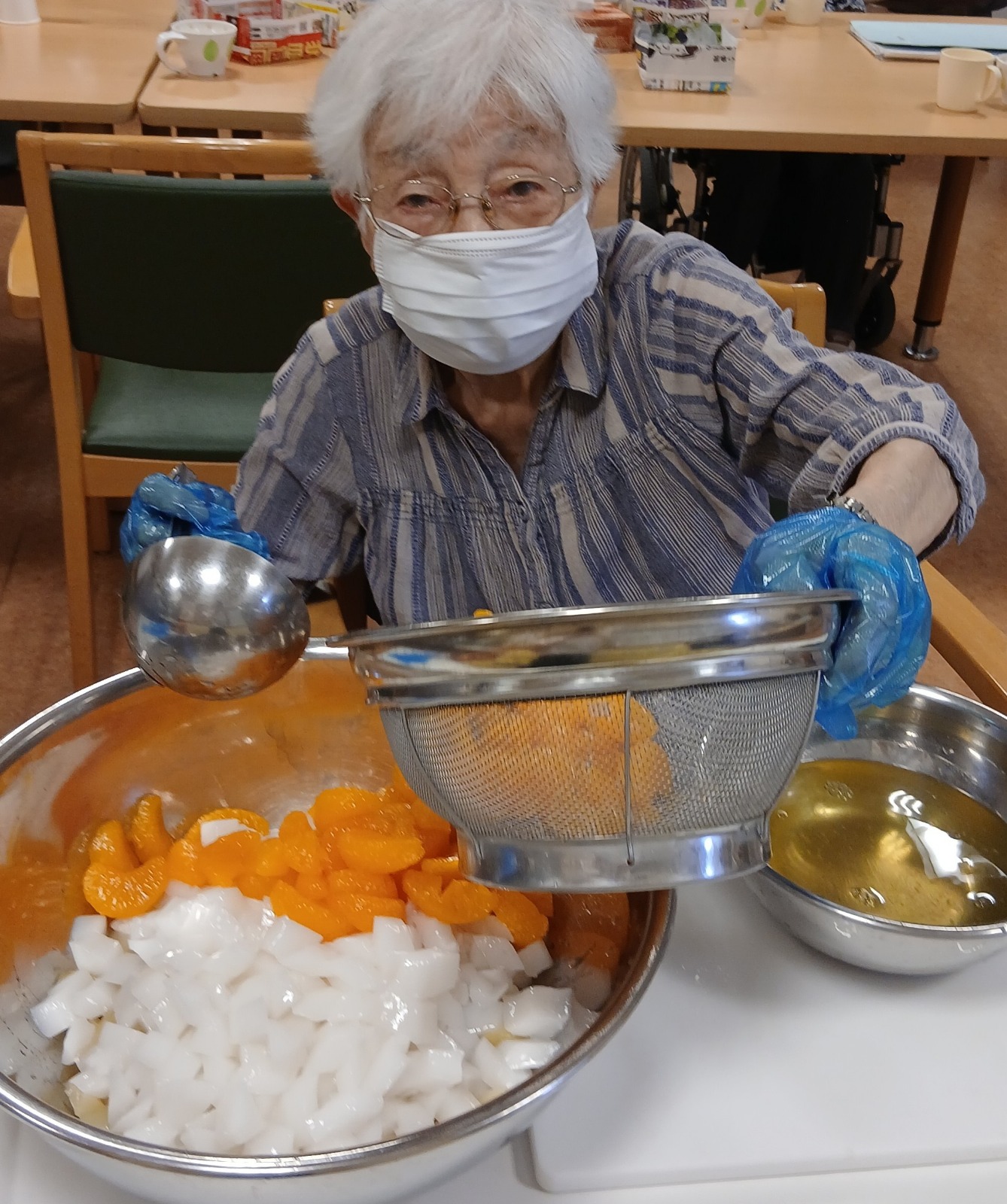 デイサービスの七夕イベントでは、利用者さんと一緒にフルーツポンチ作りを楽しみました。メントスサイダーの演出では大きな歓声が上がり、初めて見る方は驚きながらも笑顔に!フルーツを切る場面では「どう切ろうか」と相談し合う姿が見られ、和やかで温かい時間となりました。